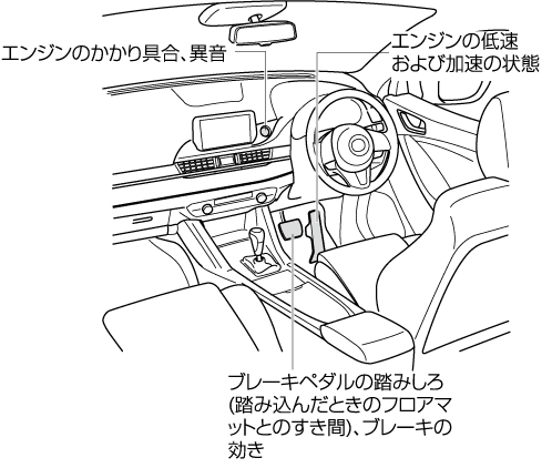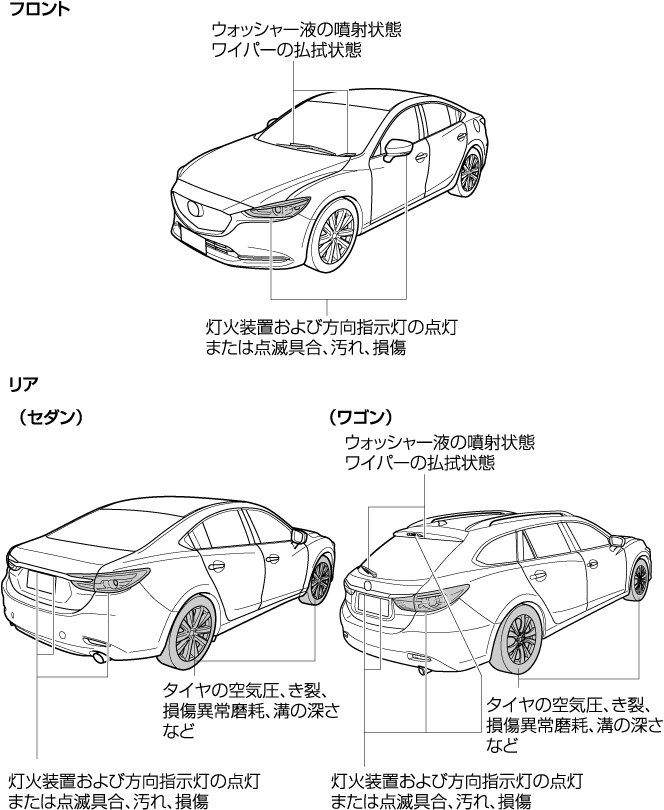 タイヤの位置交換を行なうまえにタイヤの空気圧、摩耗を点検してください。
