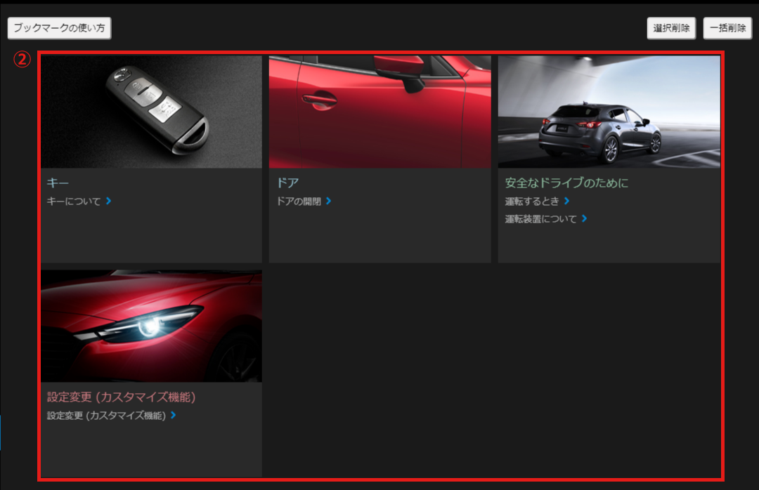 ⑧を選択すると、表示されます。閲覧したいタイトルを選択すると、操作や機能の説明が表示されます。