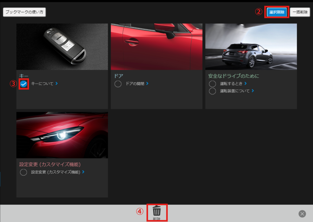 削除ボタンを選択すると選択した項目がブックマークから削除されます。