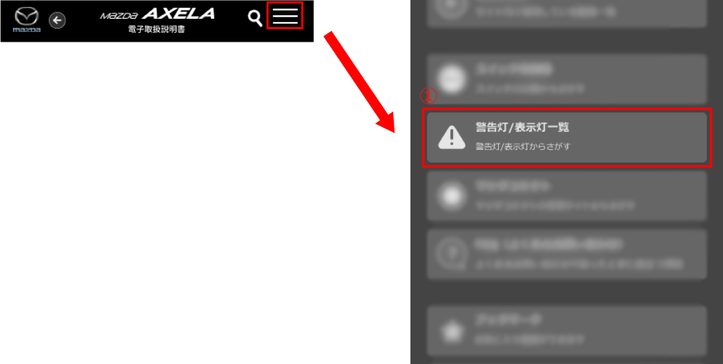 メーターに表示される警告灯/表示灯から目的の情報を検索することができます。