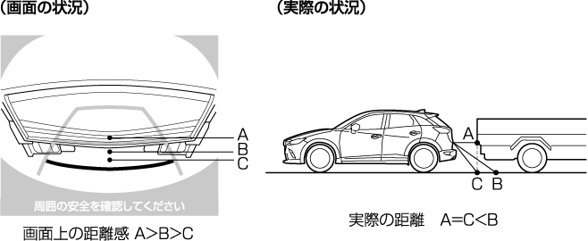 バックガイドモニターのカメラは特殊なレンズを使用しているため、画面に映る映像の距離間隔は実際の距離とは異なります。