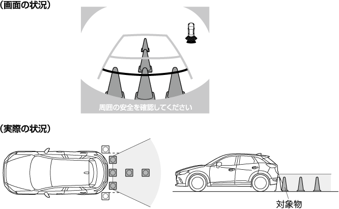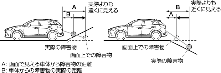 車両後方に勾配の急な上り坂 (下り坂) があるときは、カメラに映る障害物は車体後部からの距離が実際よりも遠く (近く) にあるように見えます。