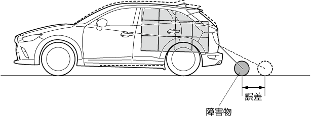 実際の路面と画面上の路面とでは誤差が生じます。距離感の誤差は事故につながるおそれがありますので、次のような誤差の起こりやすい状況を確認しておいてください。