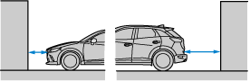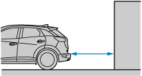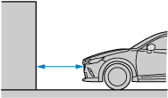 画面に映し出される駐車スペース (車庫など) の後端と距離目安線が平行に見えていても、実際には平行ではないことがあります。
