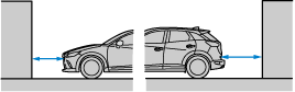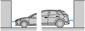 車両が駐車スペース内にはいったら、車幅延長線と駐車スペース左右の間隔が、車両付近の位置で同じくらいになるようにハンドルを操作して、ゆっくり後退します。