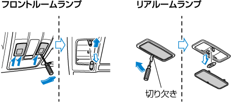 番号灯、ルームランプ、ラゲッジルームランプのレンズを取りはずすときは、マイナスドライバーなどの先端に布を巻いてご使用ください。マイナスドライバーが直接レンズや内装に当たると、傷がつくおそれがあります。