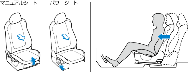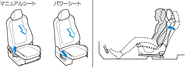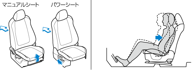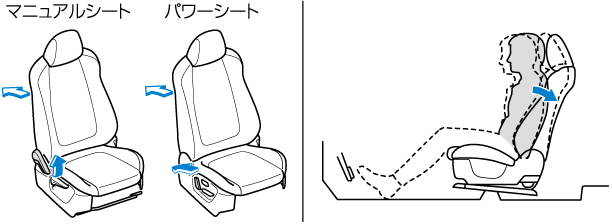 マニュアルシートはシートの高さを上げると、前方へシートが移動します。前後調節をもう一度行なってください。