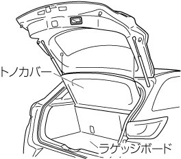 リアゲートを閉めるときは、ラゲッジボードをもとの位置にもどしてください。ラゲッジボードを立てたままリアゲートを閉めるとトノカバーを破損するおそれがあります。