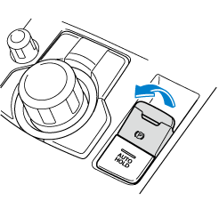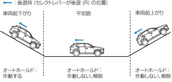 車両前上がりの状態、または平坦路でセレクトレバーを後退 (R) の位置にシフトチェンジすると、オートホールドが解除されます。必要に応じてブレーキを操作してください。