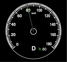 設定したい速度までアクセルペダル操作で加速し、RES スイッチを押し上げ (SET+) または押し下げ (SET-) て速度を設定します。速度を設定するとディスプレイに設定速度が表示され、クルーズスタンバイ表示 (白)からクルーズセット表示 (緑) に変わります。