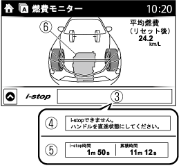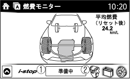 センターディスプレイ内の各アイコンを操作することによりi-stop状態表示、燃費情報、i-stop効果を切り替え表示します。また、運転終了後、エンディング表示がONのときは、今回の運転のエネルギー効率実績などを表示します。