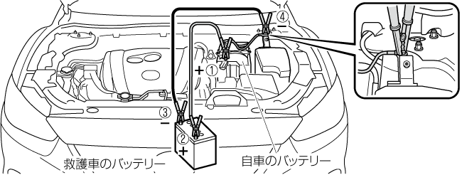 別売のブースターケーブルを使用して、救援車 (他の車) のバッテリーと自車のバッテリーを接続してエンジンをかけます。