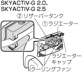 1. エンジンが十分に冷えてから、冷却水の量を点検します。冷却水量が不足しているときはラジエーターリザーバータンクの順に冷却水を補充してください。