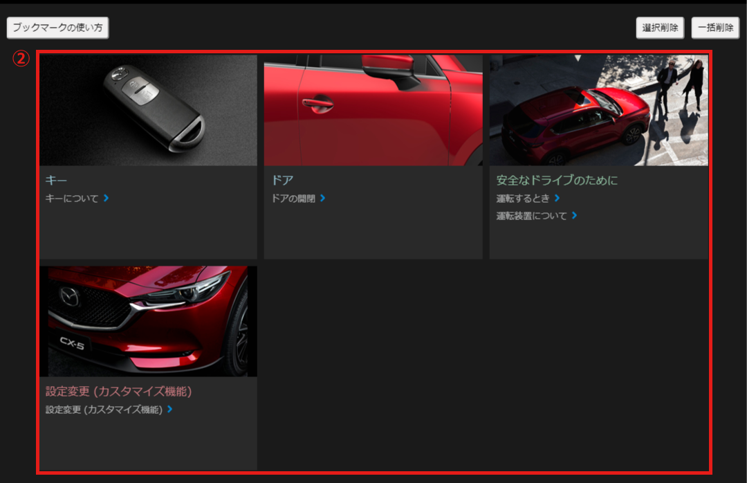⑧を選択すると、表示されます。閲覧したいタイトルを選択すると、操作や機能の説明が表示されます。