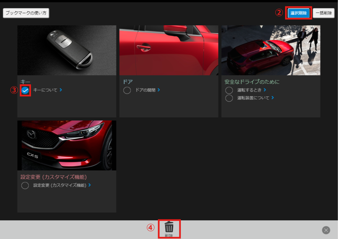 削除ボタンを選択すると選択した項目がブックマークから削除されます。