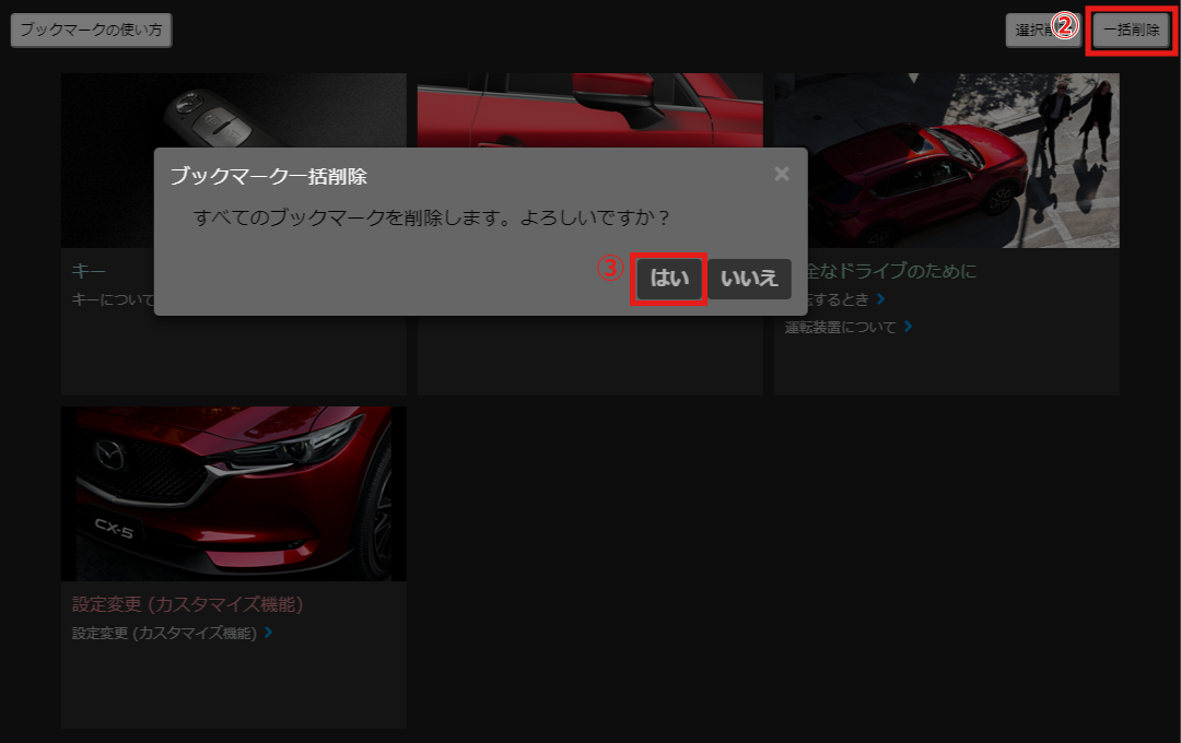 一括削除ボタンを選択すると、警告文が表示されます。