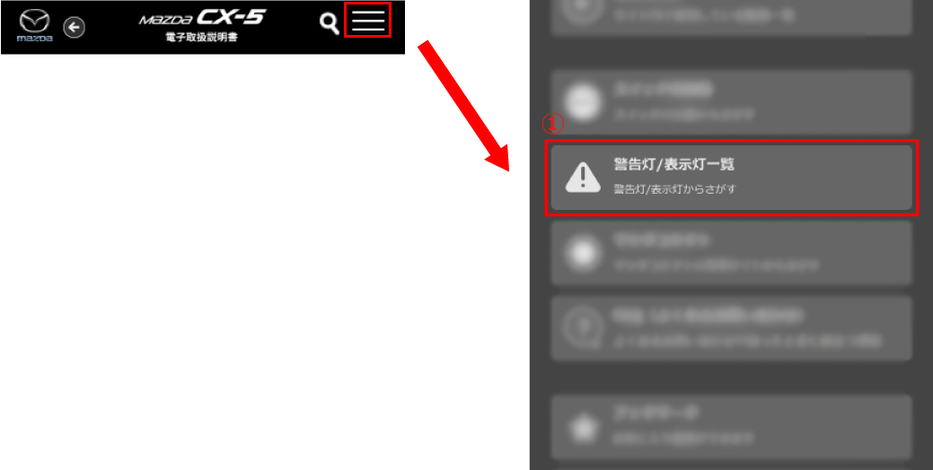 メーターに表示される警告灯/表示灯から目的の情報を検索することができます。