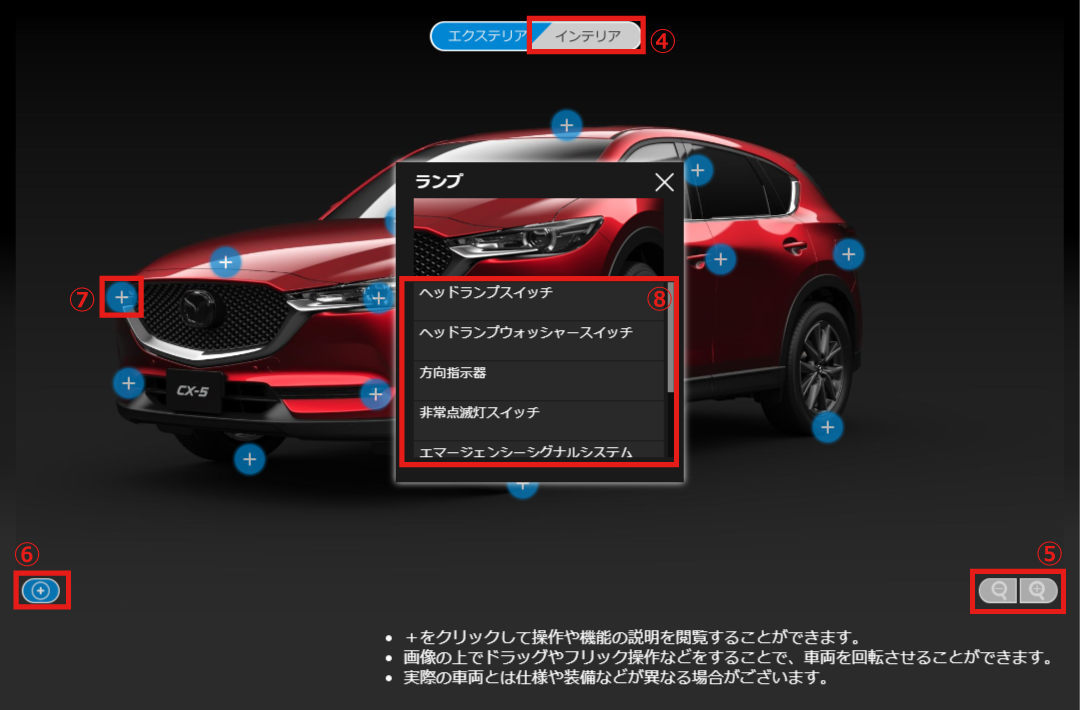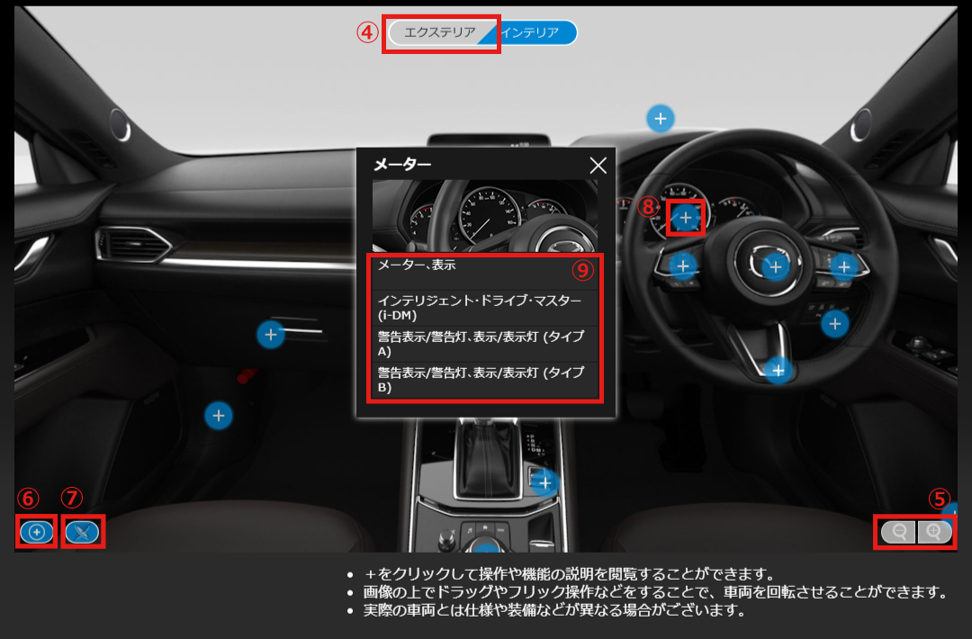 また、ジャイロ機能付きの機器をご利用の場合、インテリアの画像に限り、機器を傾けて車両の向きを変えることができます。
