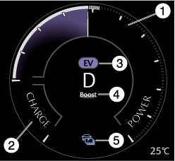 モーターやエンジンで走行に使用しているエネルギーを表示します。出力が多いほど指針が右方向へ動きます。POWERゲージの指針が右方向へ動くほどエンジンが始動しやすくなります。