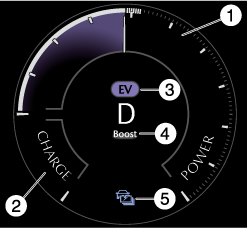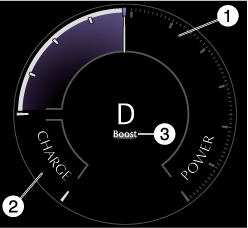 モーターやエンジンで走行に使用しているエネルギーを表示します。出力が多いほど指針が右方向へ動きます。POWERゲージの指針が右方向へ動くほどエンジンが始動しやすくなります。