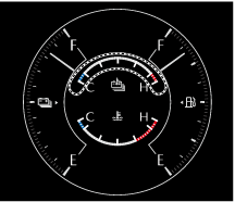 駆動用バッテリーの温度を示します。青いゲージは駆動用バッテリーの温度が低いことを示し、赤いゲージは駆動用バッテリーの温度が高く、過熱していることを示します。