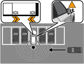 車両を後退させようとしている場合に、システムが後側方から接近する車両を検知すると、RCTAが作動します。