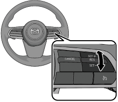 アクセルペダルを踏んで希望の速度になったところで、RESスイッチを押し上げる (SET+) または押し下げる (SET-)。