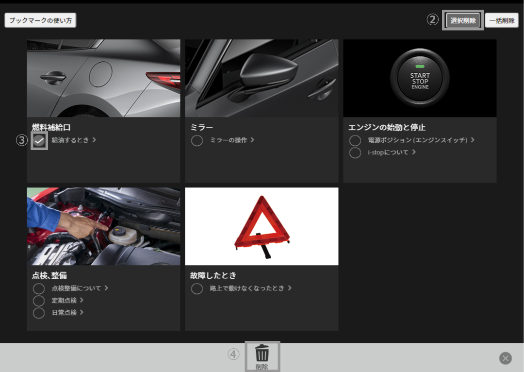 | クイックガイド | お車をご使用する際に、知っておいていただきたい項目をまとめております | |