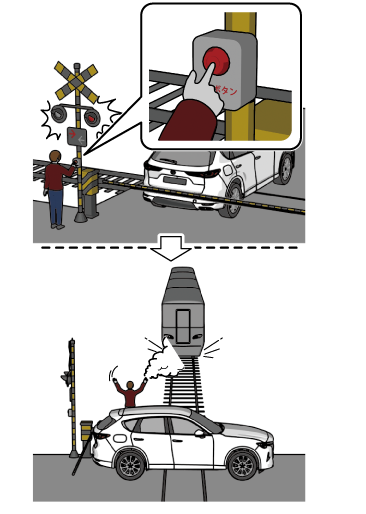 踏切の非常ボタンを押す。