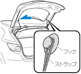 ストラップをリアゲートのフックにかけておくと、リアゲートと同時に開閉します。