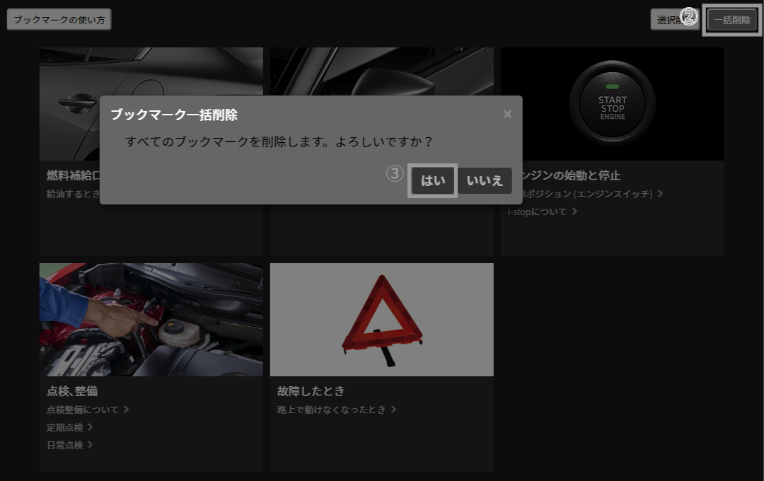 一括削除ボタンを選択すると、警告文が表示されます。