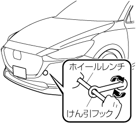 やむをえずロープでけん引してもらうときは、車両の前側にあるけん引フックを使用し、次の手順で行なってください。
