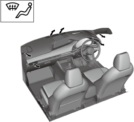 を押し、温度調節ダイヤルを中間付近で使用すると暖められた風が足元から吹き出し、比較的温度の低い風がインストルメントパネル中央および左右から吹き出します。この吹き出しは頭寒足熱を目的としています。