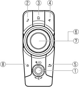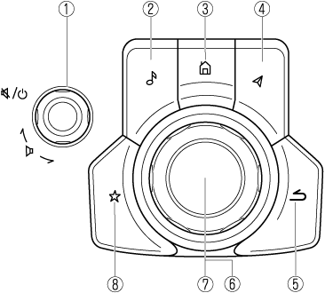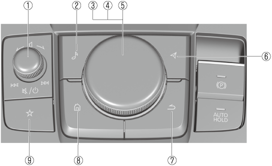 電源OFF/ON*1 長押しすると、マツダコネクトの電源がOFFになり、画面が消えます。 (Aタイプ) もう一度長押しすると、マツダコネクトの電源がONになります。 (Bタイプ) もう一度押すと、マツダコネクトの電源がONになります。 マツダコネクトの電源がOFFのときに、コマンダースイッチを押すとマツダコネクトの電源がONになります。 |