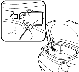 トランク内側のカバーをめくります。レバーを引いて、フューエルリッドを開けます。