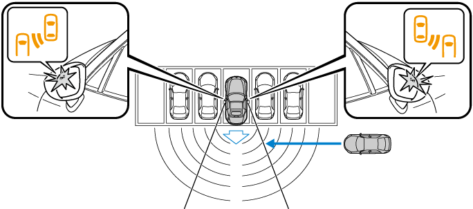 RCTAは、駐車場などから後退するときに自車の左右に接近した車両を検知して、ブラインド・スポット・モニタリング (BSM) 接近表示灯の点滅、および警報チャイムにより運転者に危険を知らせます。