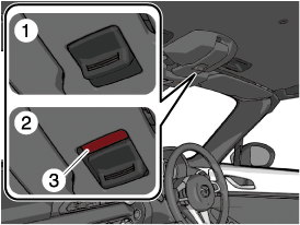 ロック解除ボタンに赤色の表示が見えているときは、ソフトトップがロックされていません。ソフトトップをもとにもどすときは確実にロックし、赤色の表示が見えないことを確認してください。ロックしないまま走行すると、ソフトトップが不意に開き、思わぬ事故につながるおそれがあります。