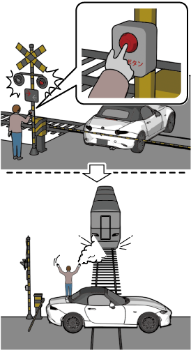 踏切の非常ボタンを押す。
