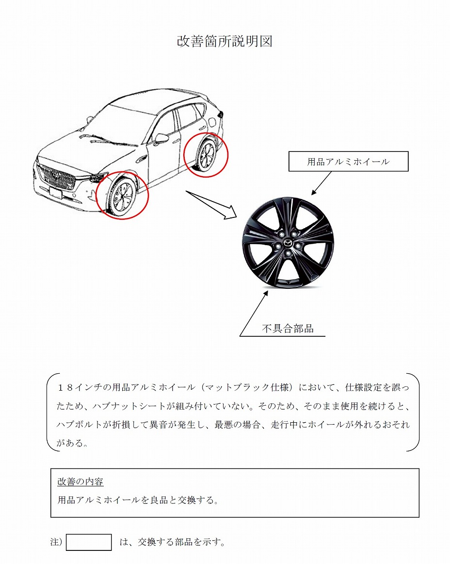 マツダ株式会社が用品として販売したCX-60およびCX-80用アルミホイールにおきまして、不具合があることが判明しましたので、以下の通り、自主改善(無料)を実施させて頂く事をお知らせ申し上げます。ご愛用のお客様にはご迷惑をおかけしますことを心よりお詫び申し上げます。